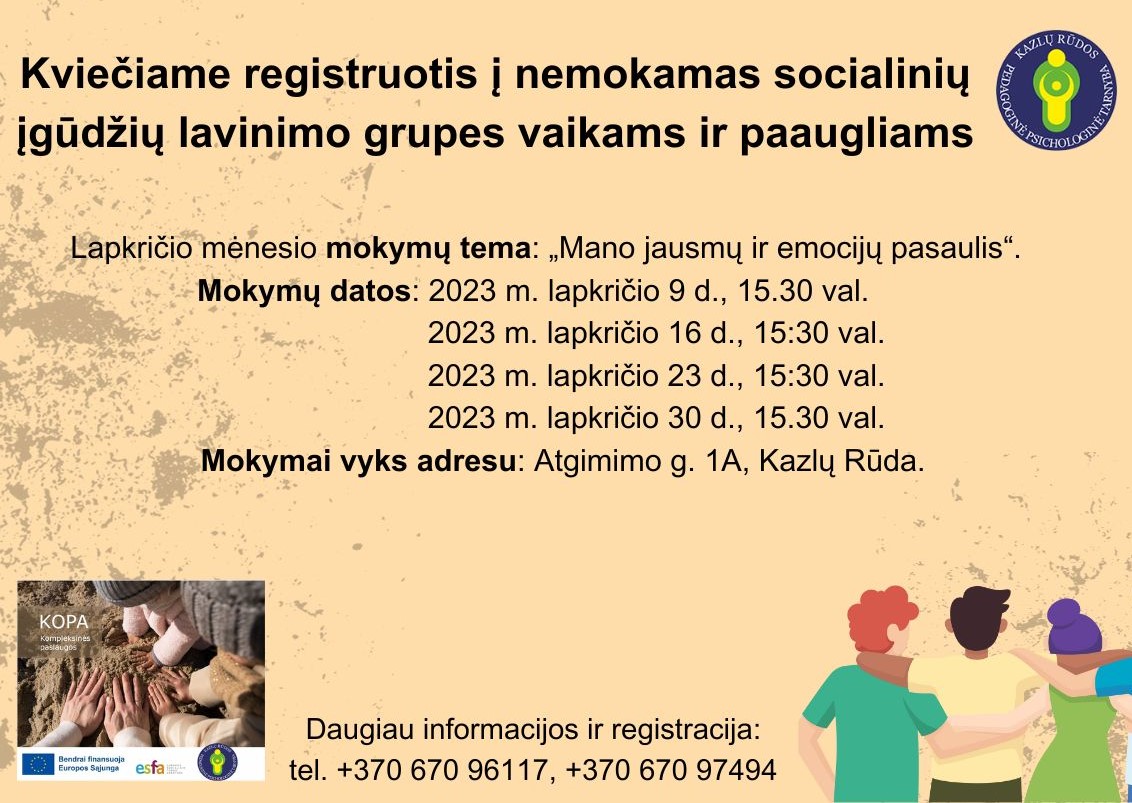 KAZLŲ RŪDOS PEDAGOGINĖ PSICHOLOGINĖ TARNYBA > Naujienos > Kviečiame į socialinių įgūdžių lavinimo grupes